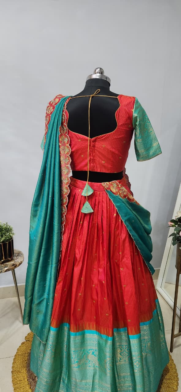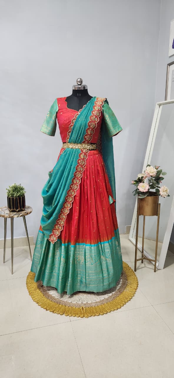 Step into a world of elegance with our Gadwal lehanga, perfectly complemented with Gadwal Fabric with dupatta. This ensemble is a harmonious blend of tradition and contemporary charm, ideal for making a statement at any event. Pair it with Akruti jewelry and a nice hairdo to highlight the intricate details of the ensemble.