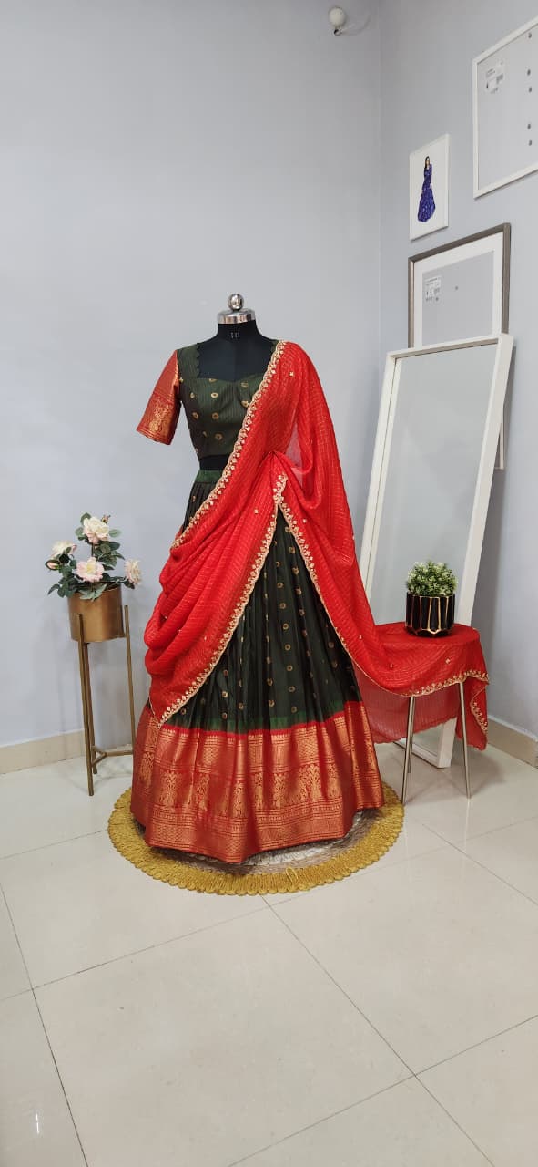 Step into a world of elegance with our Gadwal lehanga, perfectly complemented with Gadwal Fabric with dupatta. This ensemble is a harmonious blend of tradition and contemporary charm, ideal for making a statement at any event. Pair it with Akruti jewelry and a nice hairdo to highlight the intricate details of the ensemble.